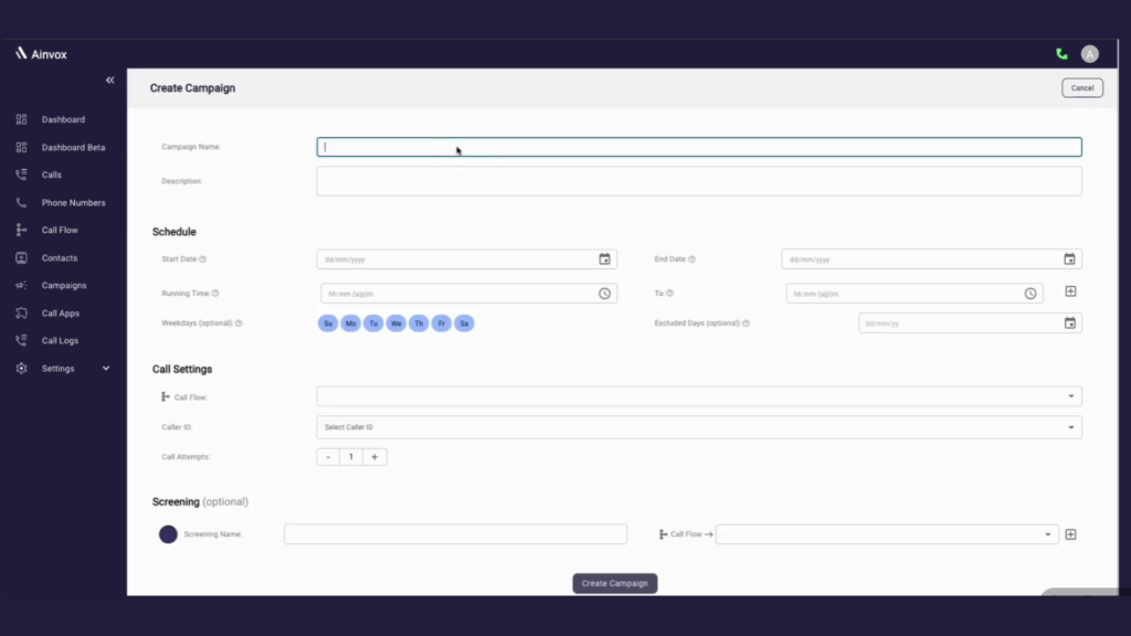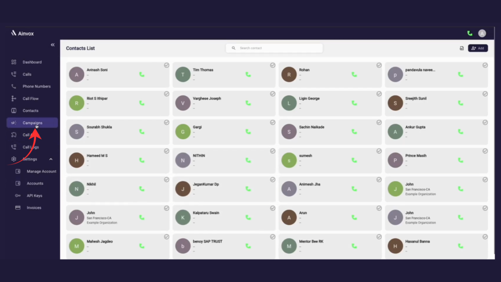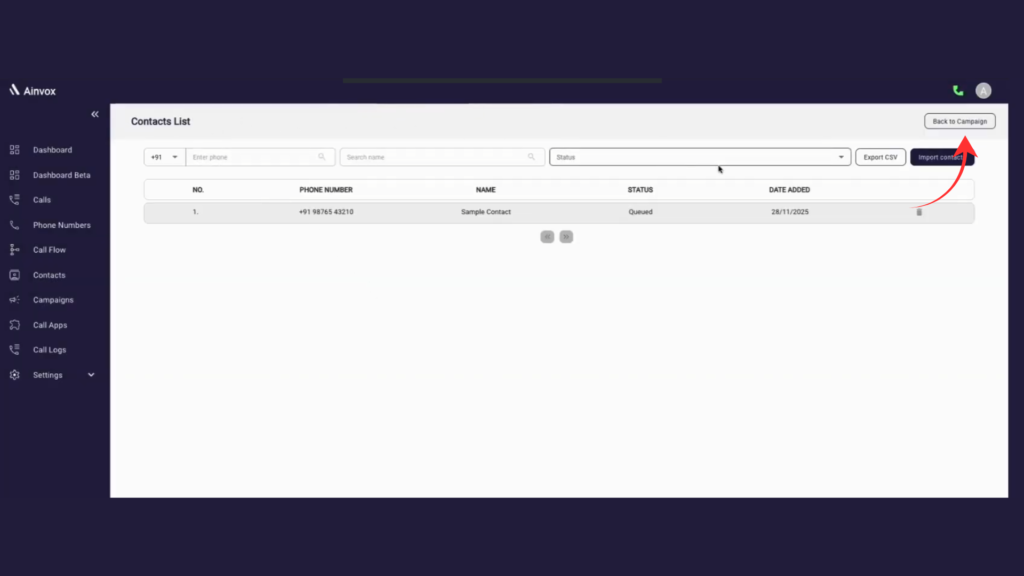 The Campaigns section allows you to create, manage, and monitor all your marketing or calling campaigns in one place. From here, you can view campaign lists, track performance, check call status, manage contact groups, and analyze campaign results easily.