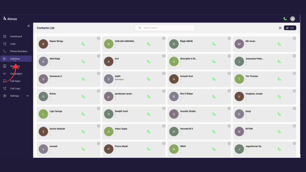 The Call Flow section allows you to design and manage how incoming and outgoing calls are handled in the system. From this page, you can create automated call journeys by connecting different actions like greeting messages, IVR menus, call routing, recordings, and agent transfers.