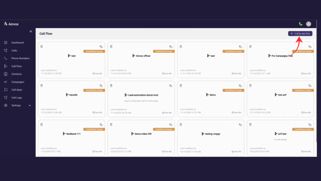 When you click on the Create New Flow button in the Call Flow section, you can build a new IVR or automated call flow from scratch. This allows you to design customized call journeys based on your business needs.