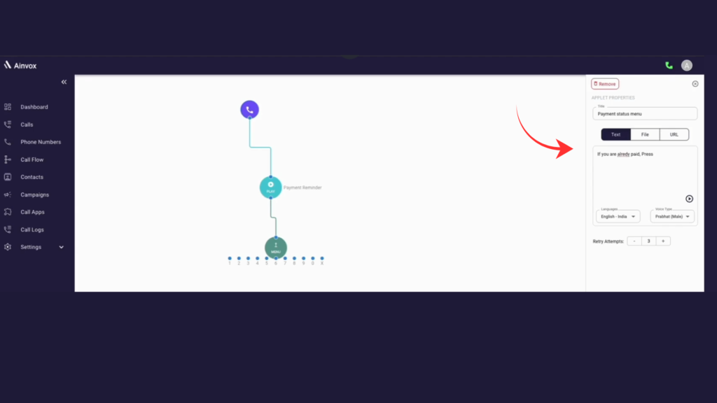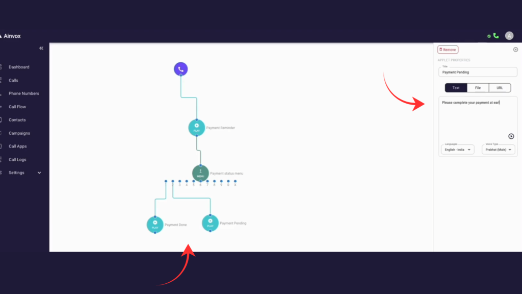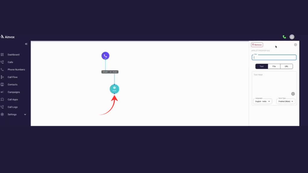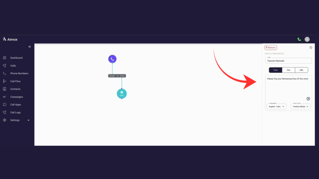 After adding the Play Applet, you can configure the voice message from the Applet Properties panel on the right. Enter the message text in the Text field, which will be converted into speech using Text-to-Speech, then select the preferred Language (such as English – India) to ensure clear pronunciation. Finally, choose a Voice Type (male or female) to match your communication style, preview the message if needed, and save the flow.