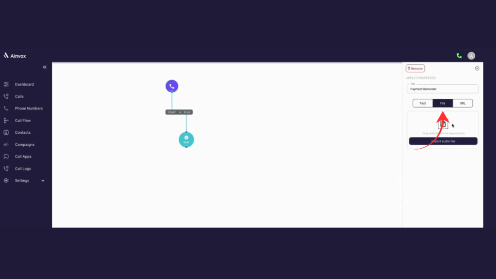 To use a pre-recorded message, select the File option in the Applet Properties panel and upload your audio file by clicking or dragging it into the upload area. Once uploaded, the system will play this recorded message in the call flow.