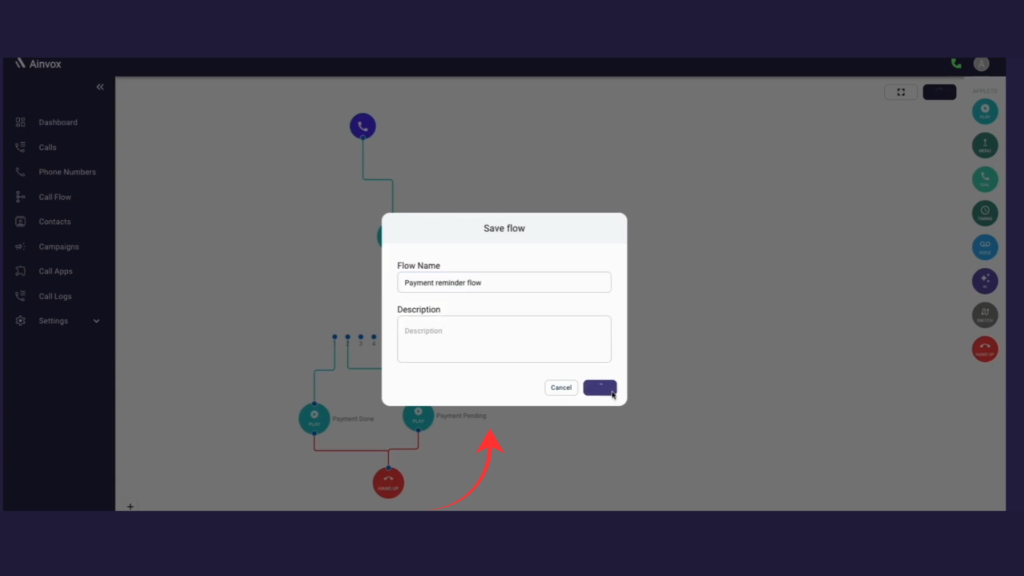 The Hang Up node ends the call immediately once the flow reaches it, ensuring the conv ersation closes properly after the final message. The Save Flow option stores your entire call setup, including all nodes and connections, so you can edit, activate, or assign it later.